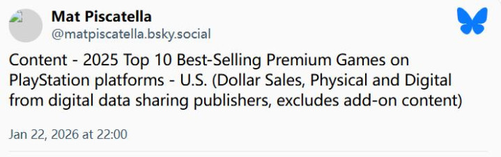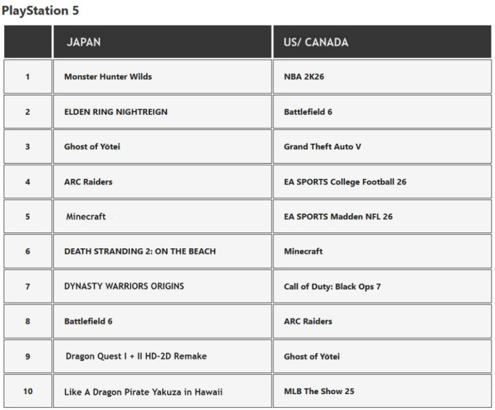 该榜单由《NBA 2K26》领衔,几乎包含所有一年出一作的体育游戏,如《College Football 26》、《麦登橄榄球26》、《MLB The Show 25》,此外就是《战地风云6》、《GTA5》、《Arc Raiders》、《使命召唤:黑色行动7》这些。榜单中,《羊蹄山之魂》是唯一一款单机非在线游戏。